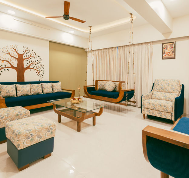 This 4 BHK residence blends functionality with contemporary Indian aesthetics, reflecting a modern yet rooted design approach. The interiors are thoughtfully curated with a harmonious palette of soft neutrals and deep blues & greens, invoking a sense of calm and sophistication.
