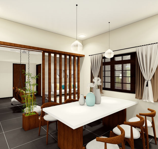 This G+1 storied farmhouse in Mamnoli blends rustic charm with modern comfort, set amidst a lush green landscape of mango, chickoo, banana, and other native trees. The architecture showcases a traditional sloped Mangalore-tiled roof with exposed brick columns, wooden balustrades, and wide verandahs that promote natural ventilation and interaction with the outdoors. The built form is low-slung and harmoniously integrates with the rural surroundings.